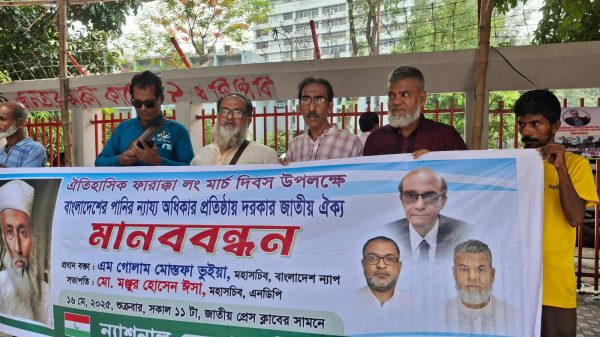 BDNAP NEWS 15-05-2025 ঐতিহাসিক ফারাক্কা লংমার্চ ভারতের পানি আগ্রাসনের বিরুদ্ধে লড়াই ও সংগ্রামের অনুপ্রেরনা বলে মন্তব্য করে বাংলাদেশ ন্যাশনাল আওয়ামী পার্টি-বাংলাদেশ ন্যাপ শীর্ষ নেতৃদ্বয় বলেন, ‘ফারাক্কার ভয়াবহতা সম্পর্কে মজলুম জননেতা